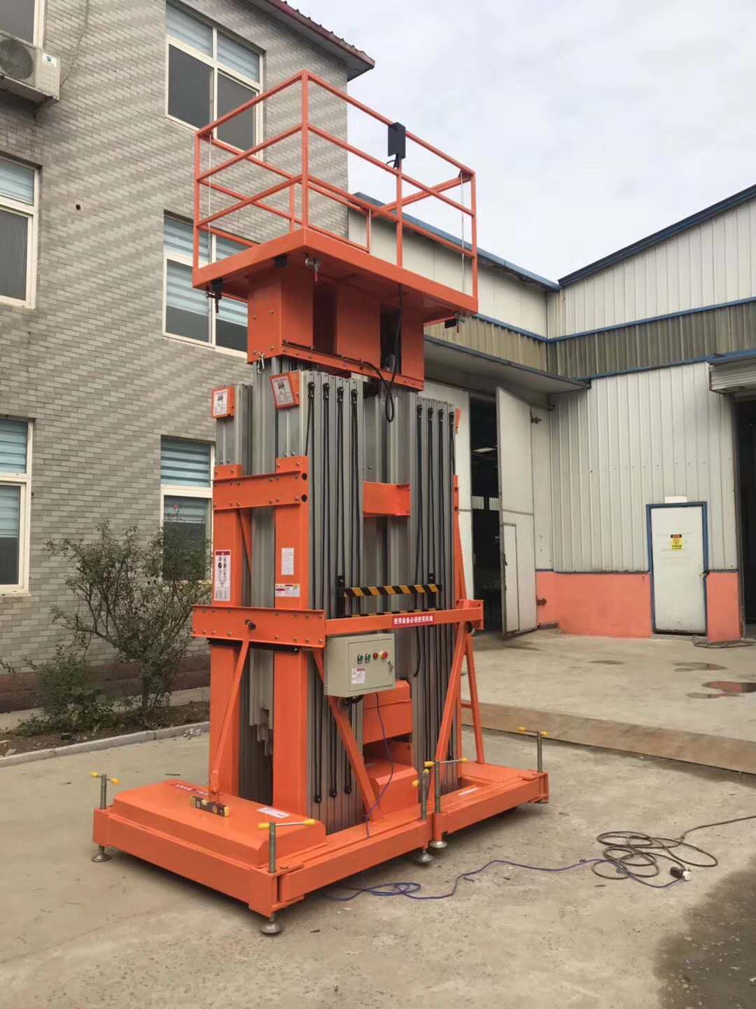 Aluminum alloy aerial working platform adopts high strength aluminum molding material. The series of products have four types for customers to choose, such as single-mast, double-mast, treble-mast or four-mast. It is suitable for workshops, guesthouses, mansions, department stores, stations, airports and stadiums, etc.